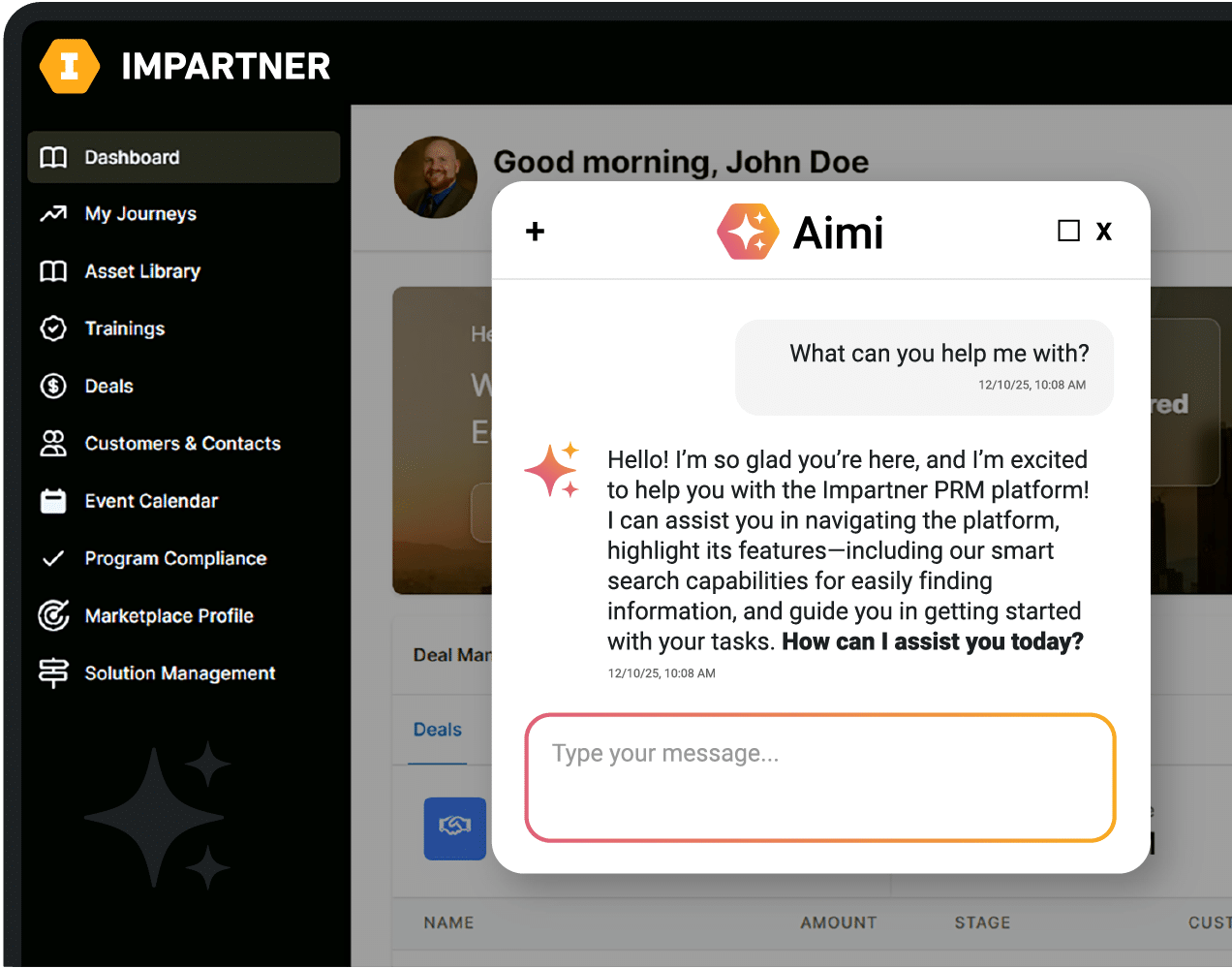 With deep integration across Impartner’s ecosystem, Aimi ties together your content, workflows, automations, and partner context into a unified experience.